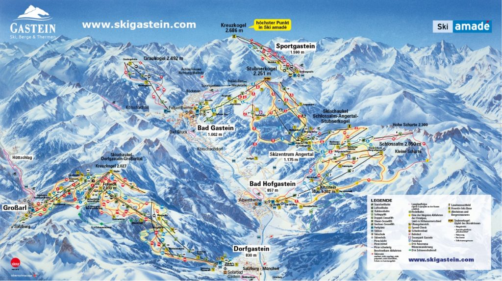 Variety-packed skiing enjoyment awaits you during a winter vacation in the famous Gasteiner valley. 5 spacious skiing areas up to 2.700 metres high, additionally deep powder- and mogul slopes, carving runs and Freerides put a lot of variety to your holiday. Up to 50 cable-cars and lifts with totally more than 220 kilometres of best-groomed slopes characterise this attractive area. After an exhausting skiing day, you will find relaxation in the Thermal SPAs and the well-equipped Wellness oases in the multifaceted hotels. Also, non-skiers profit from this offer as well as from the other attractions aside the slopes like cross-country skiing or romantic walking trails.